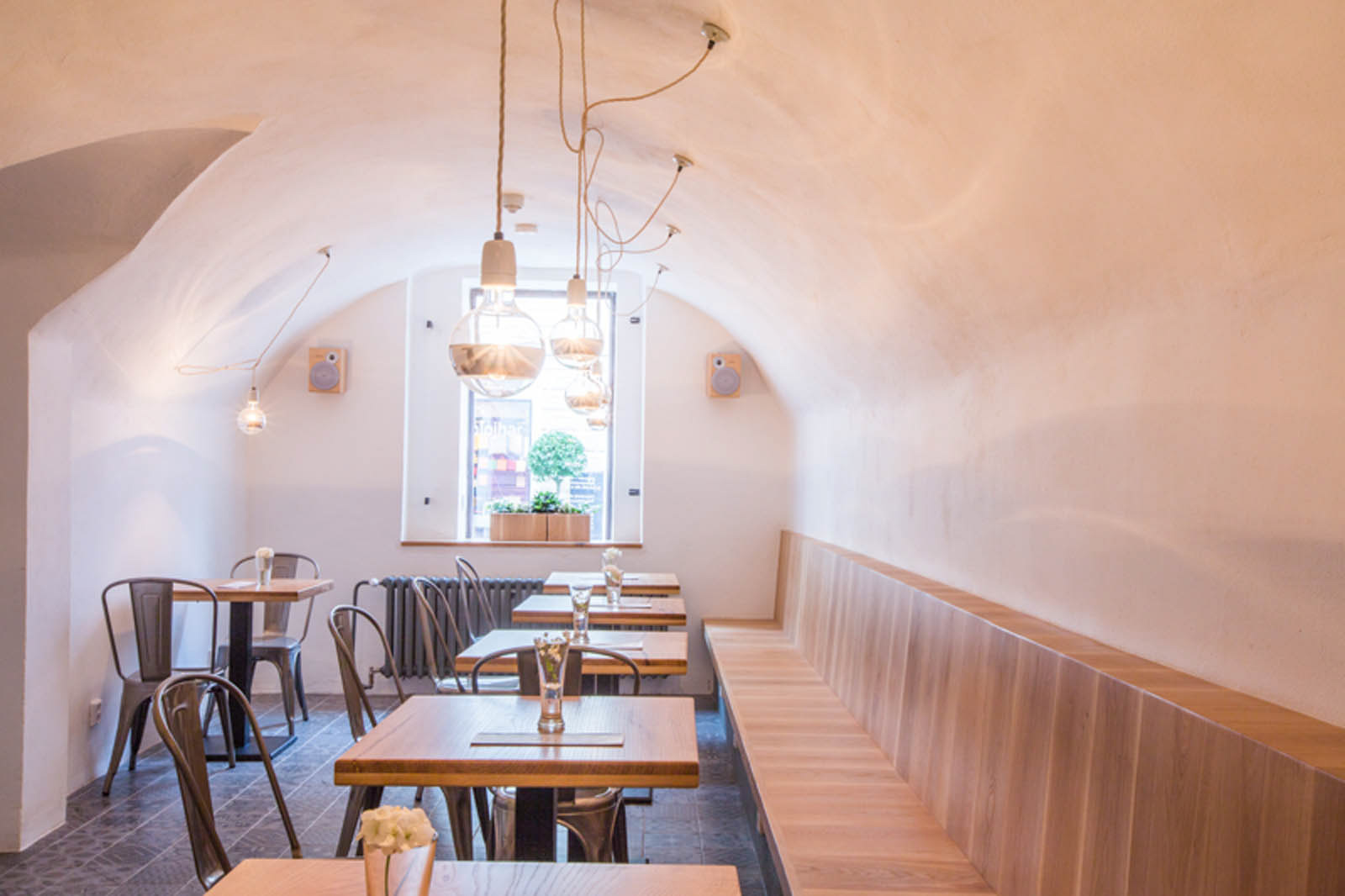 Kavárna Široko v Široké ulici v Českých Budějovicích, která slouží zároveň i jako recepce pro ubytování v apartmánech v dalších podlažích. Ve starém baráku jsme se chovali postaru, obyčejně – kachlová podlaha, světlé omítky, stoletý dub a klasické žárovky s vlákny. Bar v centru dispozice jako spojující prvek dvou rozdílných prostorů. A především nejlepší káva široko daleko.