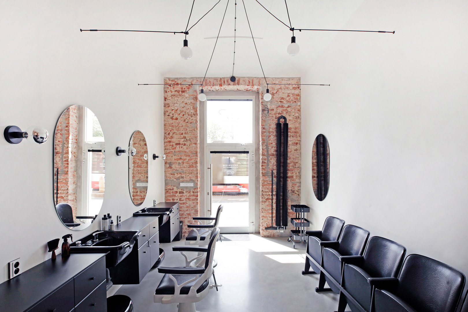 Jsou interiéry, které vznikají několik let, i takové, které jsou hotové za dva měsíce. Kadeřnictví u Smíchovského nádraží je ten druhý případ. A přestože výsledek bývá často úměrný strávenému času a rozpočtu, pokusili jsme se o výjimku potvrzující pravidlo. Nevelký prostor starého kadeřnictví nadohled nádraží čekala nutná generální rekonstrukce. Přání majitelky bylo zvládnout celý proces za dva měsíce, tedy v čase mezi dvěma stříháními jejich běžného zákazníka. Časovým i ekonomickým možnostem realizace odpovídal koncept. V malém prostoru spíše odebírat než přidávat, přiznat maximum možného a vybavení redukovat pouze na to podstatné - křeslo, zrcadlo, světlo. V této koncepci má proto svou přesnou pozici i podobu radiátor stejně jako umyvadlo, nebo věšák na smeták. V rámci kompletní rekonstrukce byly osazeny nové hliníkové prosklené vstupní dveře s nadsvětlíkem, které jsou zároveň jediným oknem do ulice - výlohou. Byly provedeny kompletní nové instalace, nová betonová podlaha opatřená cementovou stěrkou a nové omítky. Stěny příčně taktující podélný prostor bylo osekány a ponechány v podobě režného zdiva jako vymezení jednotlivých částí prostoru - pánského holičství, dámského kadeřnictví a centrální částí s pokladnou a nutnou administrativou, která obě tyto čísti spojuje. Původní stará kadeřnická křesla byla repasována. Repase nově získané řady sedaček ze starého klubového kina se ujala sama majitelka s rodinou.