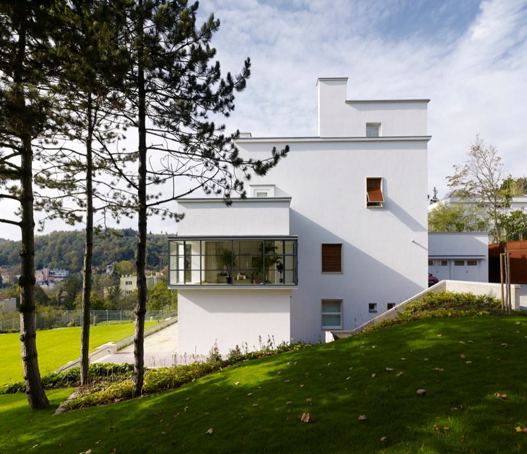 Stavební část byla realizována se snahou o maximální shodnost s původním domem. V tomto smyslu bylo možné porovnávat nový stav s původním prováděcím projektem z roku 1925 a s dochovanými fotografiemi z doby před druhou světovou válkou. Bylo přirozené, že zůstanou zachovány všechny autentické prvky, zbylo jich však jen několik. K nejdůležitějším patřilo jedno původní okno z hudebního pokoje, ocelová okenní konstrukce zimní zahrady, svislé pásové ocelové okno na schodišti, dřevěná garážová vrata a vstupní dveře bočního vstupu. Všechny tyto prvky byly pečlivě restaurovány a osazeny v nové stavbě na původní místo.